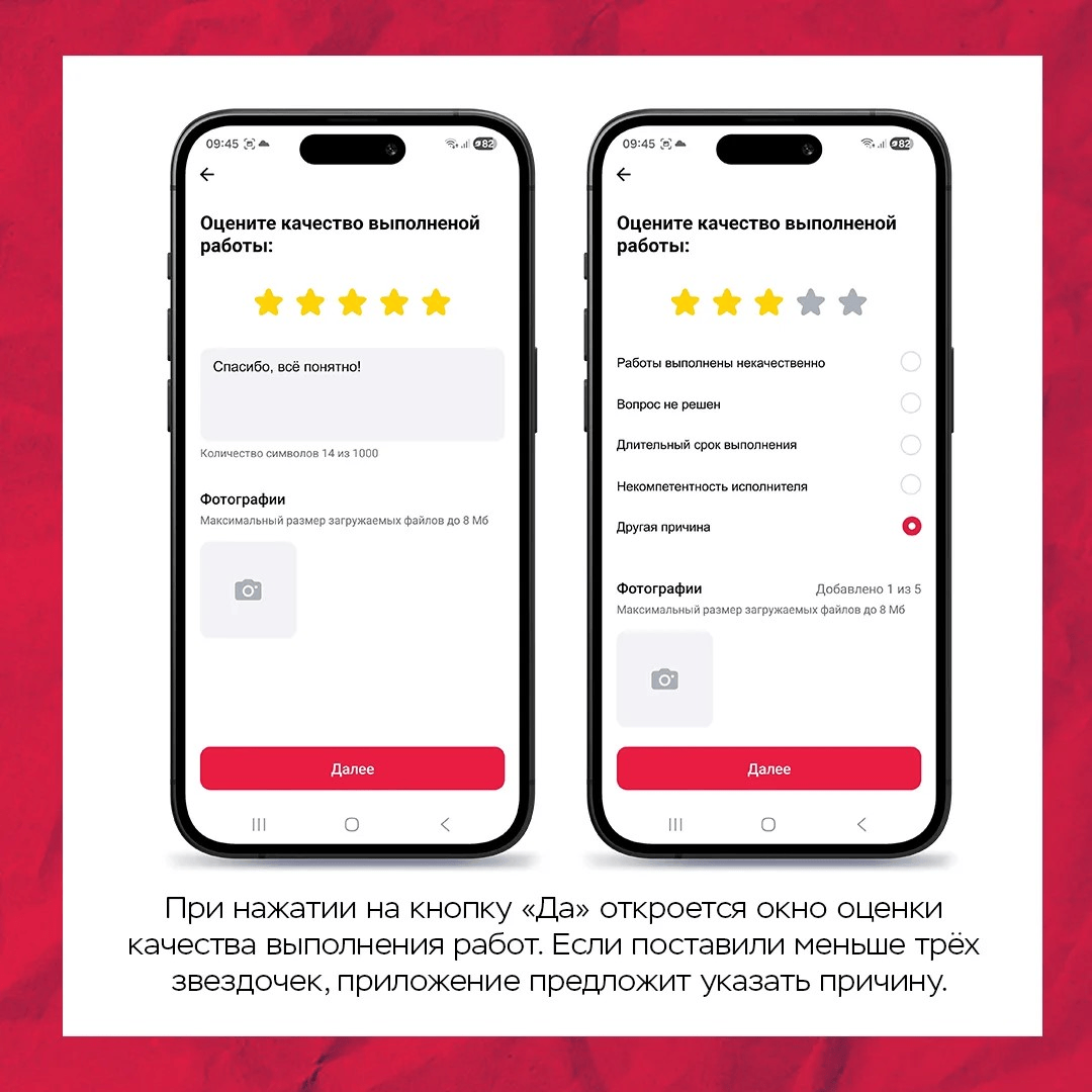 4. После того, как заявка перейдёт в статус «Выполнено», вам предложат подтвердить выполнение работ. Если вы нажмёте на кнопку «Нет», заявка вернётся в работу. При нажатии на кнопку «Да» откроется окно оценки качества выполнения работ. Если поставили меньше четырёх звездочек, приложение предложит указать причину.