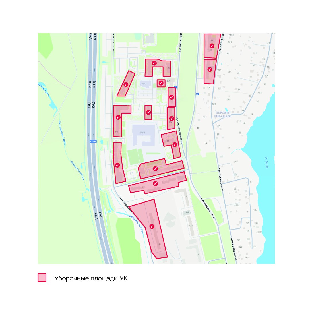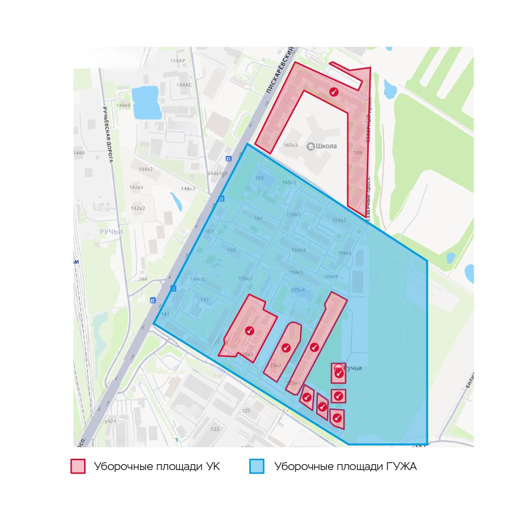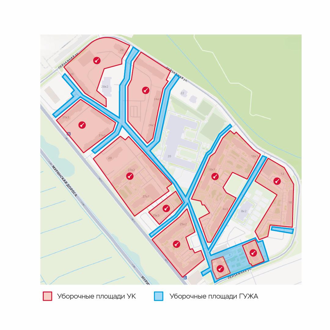 Красным цветом на схемах обозначены уборочные площади управляющей компании.