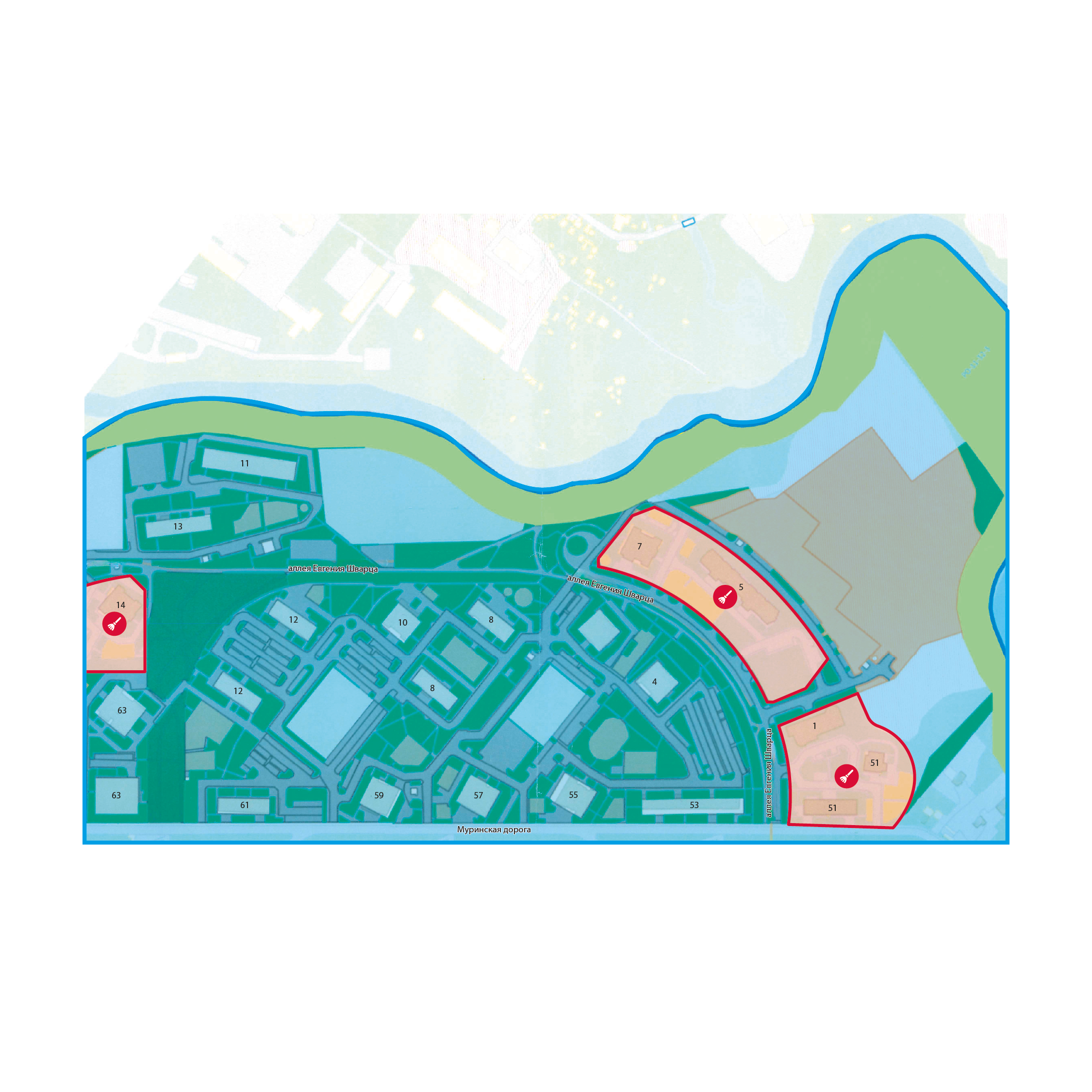 — ЖК «Новая Охта на речке»: Муринская дорога, д. 51 и прилегающий к нему земельный участок, аллея Евгения Шварца, д. 7 и д. 5, а также д. 14 и прилегающие к ним земельные участки.