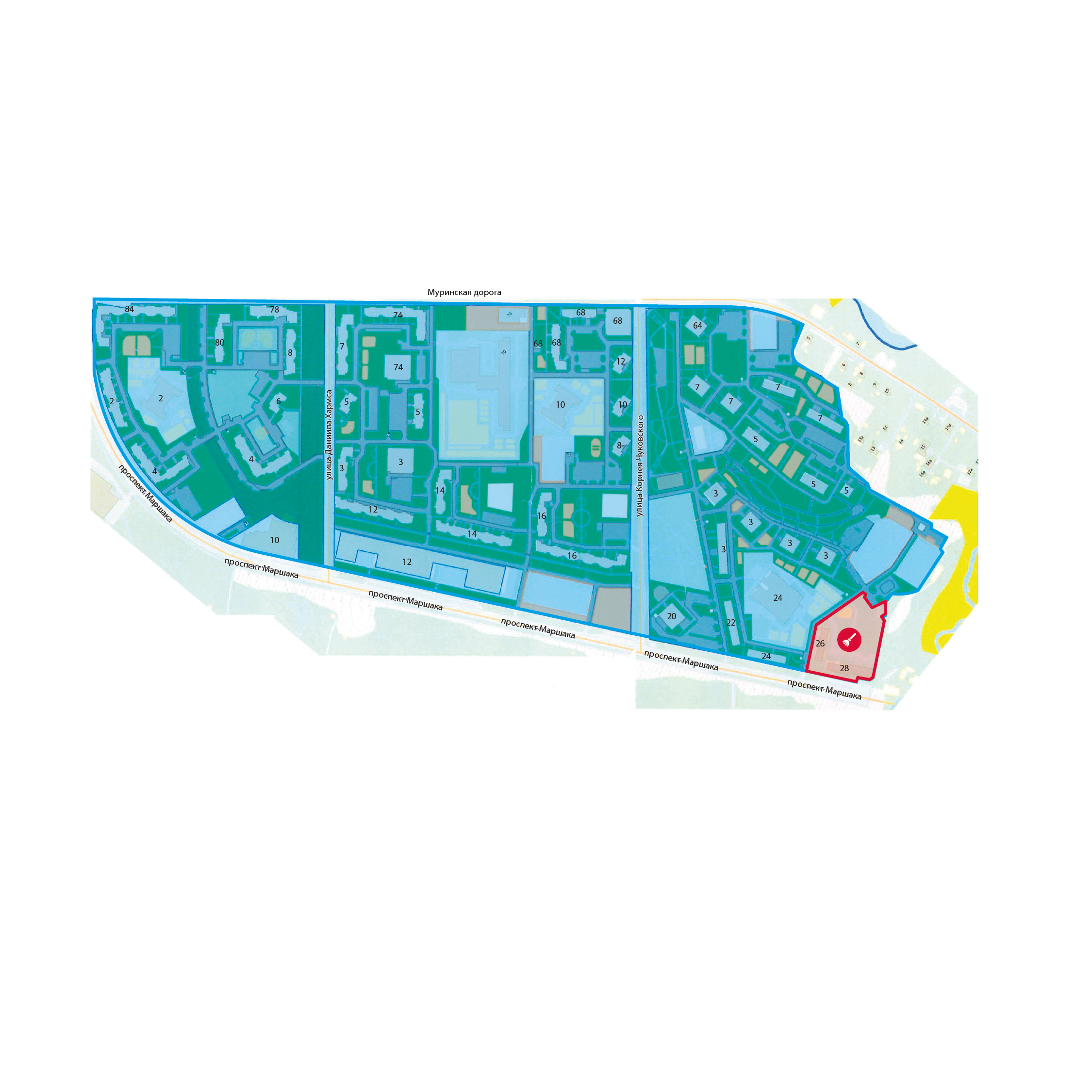 — ЖК «Новая Охта»: пр. Маршака, д. 26 и 28, а также прилегающий к ним земельный участок.